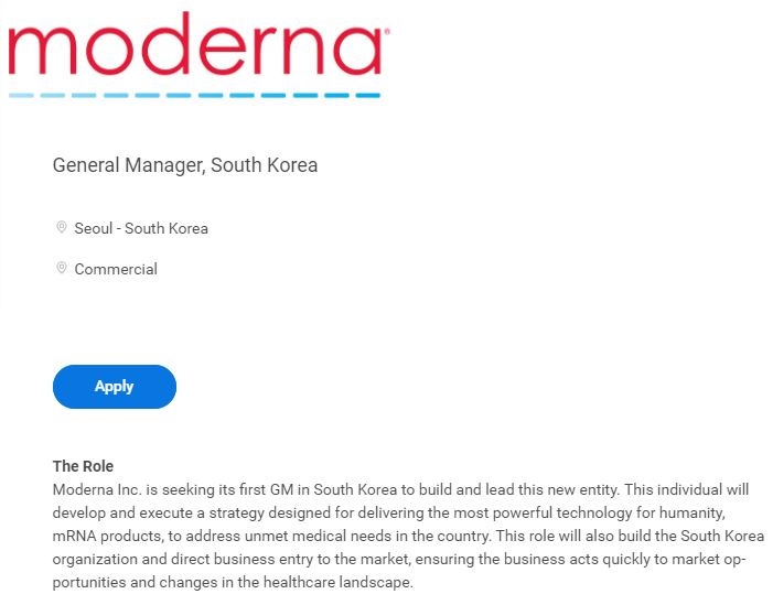 ◆'Establishment of ‘Moderna Korea’ … why enter Korea? According to industry sources on the 3rd, Moderna had posted an announcement on its website to hire a GM (General Manager) for Korea.