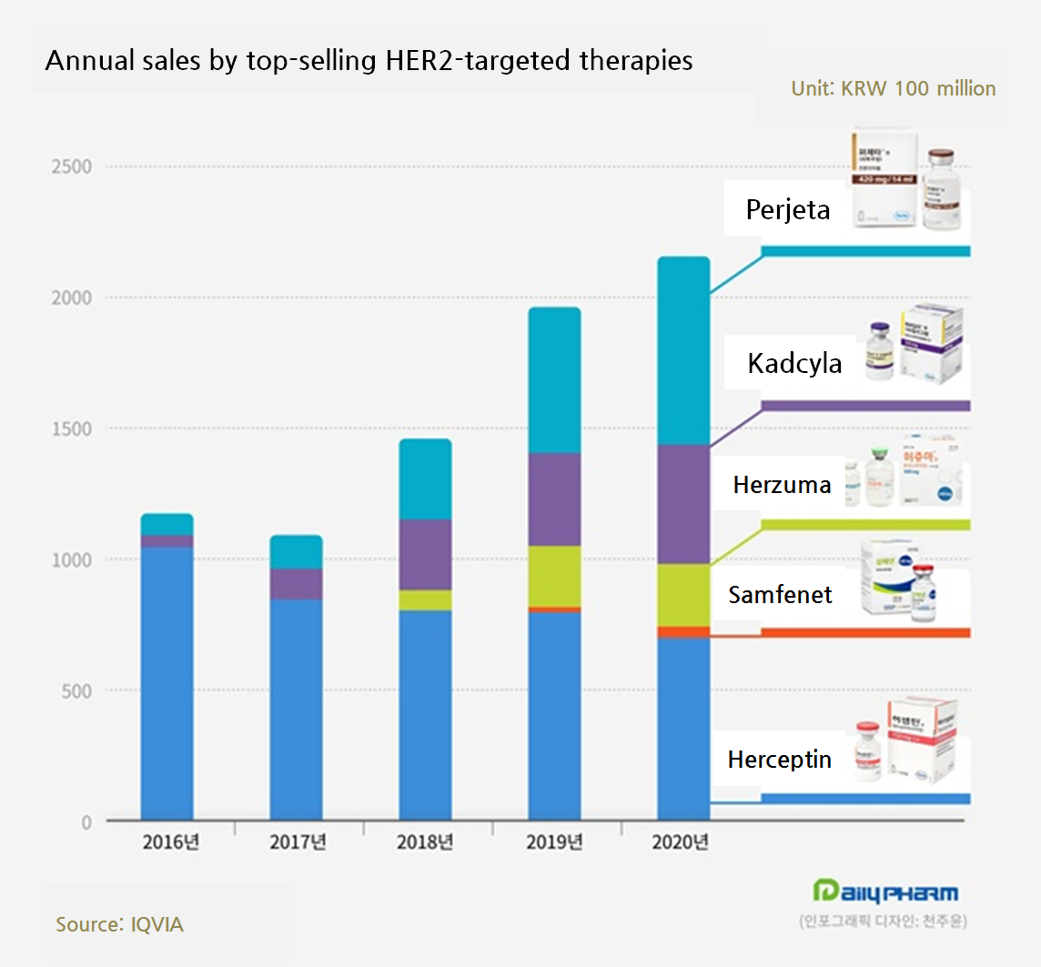 The South Korean market for targeted therapy prescribed to treat human epidermal growth factor receptor 2 (HER2)-positive breast cancer has exceeded 200 billion won in sales last year.