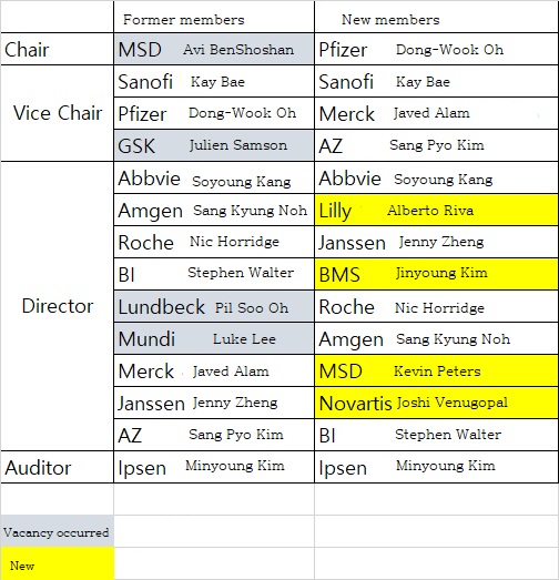 Sang Pyo Kim, CEO of AstraZeneca Korea and Javed Alam, CEO of Merck Korea, were appointed for the Vice Chair, arising from the appointment of President Oh Dong-wook and the appointment of former GSK Korea CEO to the head office by Julien Samson.