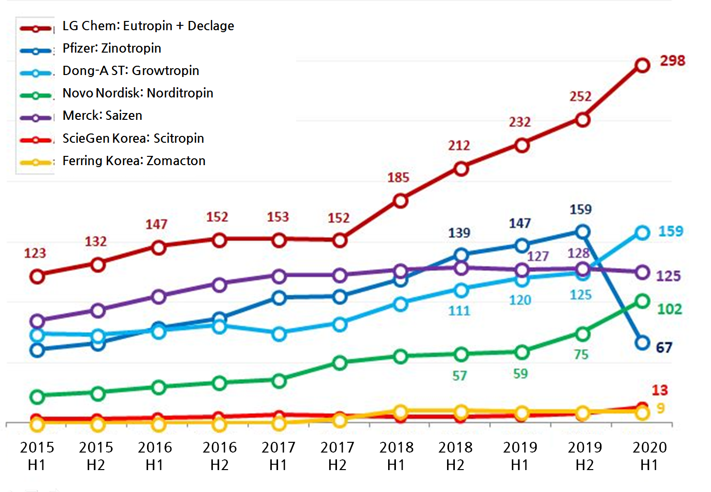 A pharmaceutical industry insider explained, “Regardless of declining birth rate, the growth hormone market has been surging as the expanded healthcare reimbursement was granted since last year,” and as “Pfizer took a hard hit with the supply issue in the first half of the year, its competitors aggressively tackled the market.”