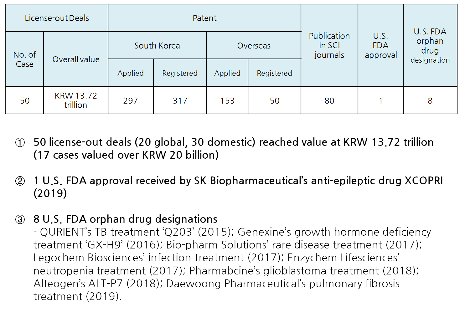 The government bodies’ goal also included obtaining 1,859 overseas patents, winning 269 IND approvals, signing 100 license-out deals, receiving seven orphan drug designations, and generating 100 billion won worth of an annual import substitution effect.