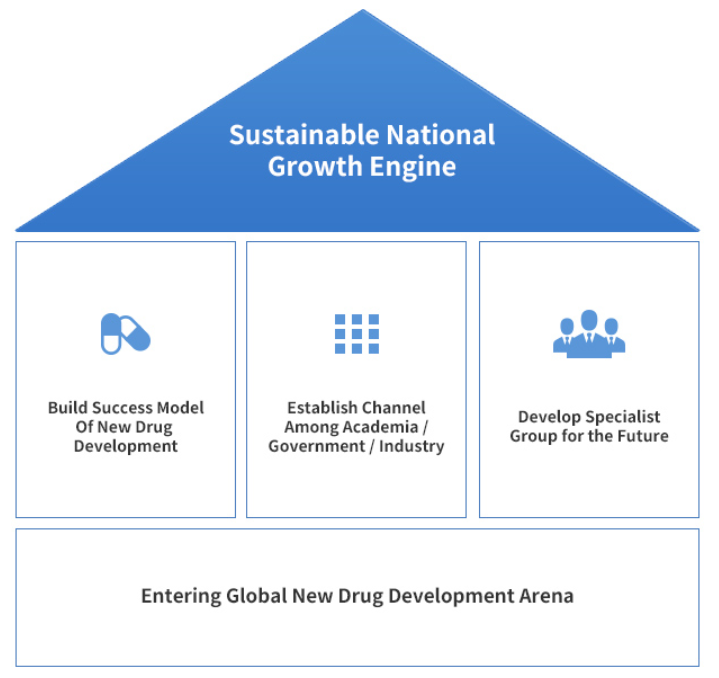 The Ministry of Science and ICT (MSIT, formerly known as Ministry of Science, ICT and Future Planning at the time of establishment), the Ministry of Trade, Industry and Energy (MOTIE), and the Ministry of Health and Welfare (MOHW) have jointly invested 1.6 trillion won (530 billion won by government, 530 billion won by private) for over 10 years through R&D investments to seek 10 global new drugs.