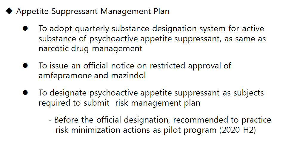 Some of the approaches unveiled were introducing quarterly active substance designation system like the narcotics control, notifying amfepramone and mazindol as restricted substance, and designating psychoactive appetite suppressants as subjects to submit a risk management plan (RMP).