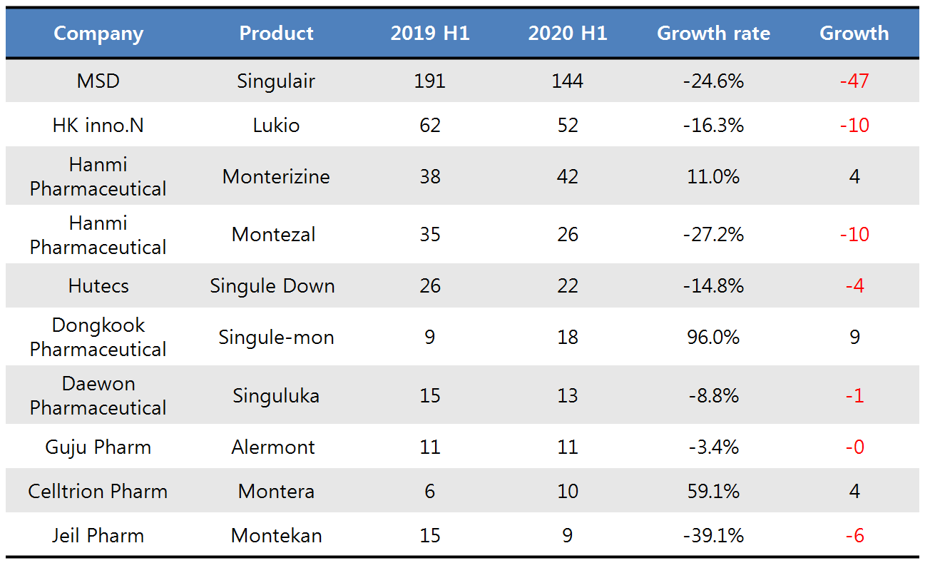 Hanmi Pharmaceutical’s Montezal prescription was brought down from 3.5 billion won to 2.6 billion won by 900 million won (27.2 percent), while Hutec’s Singule Down prescription slipped from 2.6 billion won to 2.2 billion won by 400 million won (14.8 percent).