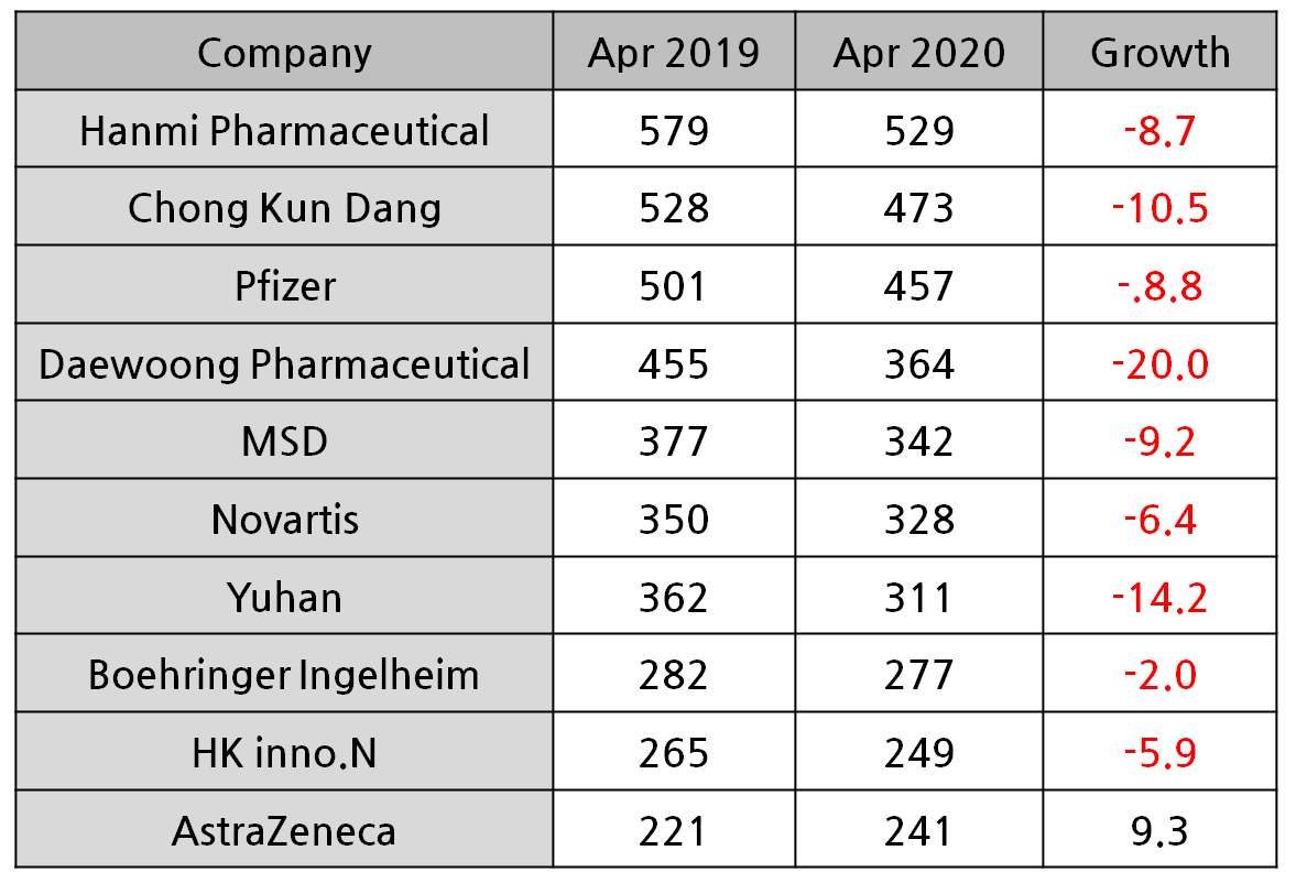Among the top ten companies—Hanmi Pharmaceutical, Chong Kun Dang, Pifzer, Daewong Pharmaceutical, MSD, Novartis, Yuhan, Boehringer Ingelheim, HK inno.N and AstraZeneca—nine companies except for AstraZeneca had stagnating prescription volume in April than the year before.