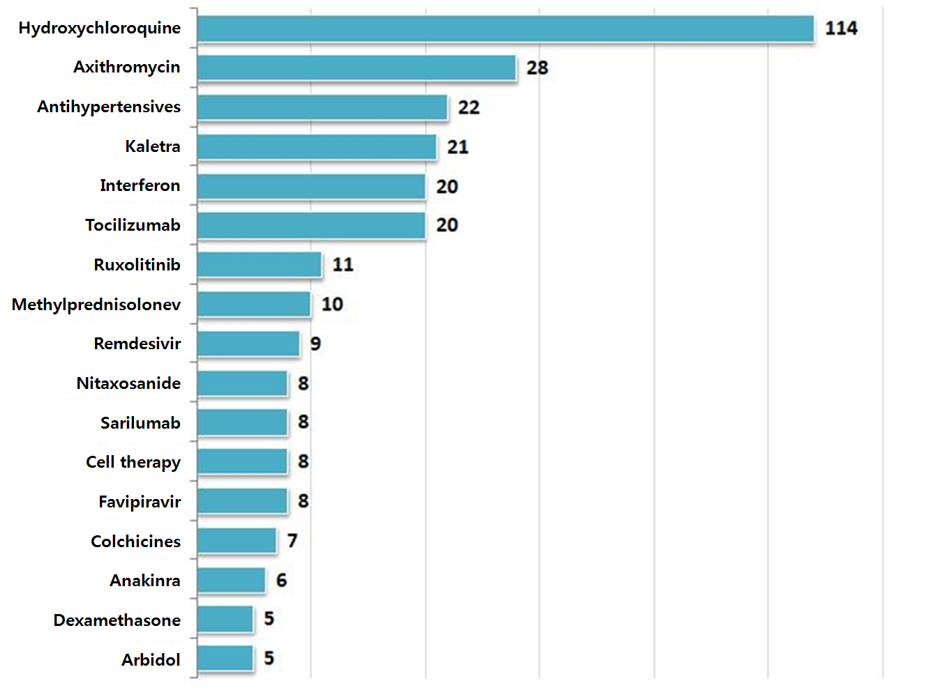 27 (Source: ClinicalTrials.gov) Currently, hydroxychloroquine has been the most popular medicine to be tested.