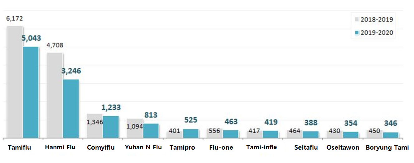 Even the prescription volume of Roche’s Tamiflu, the original oseltamivir, was decreased by 18.3 percent from 6.2 billion won to 5.0 billion won.