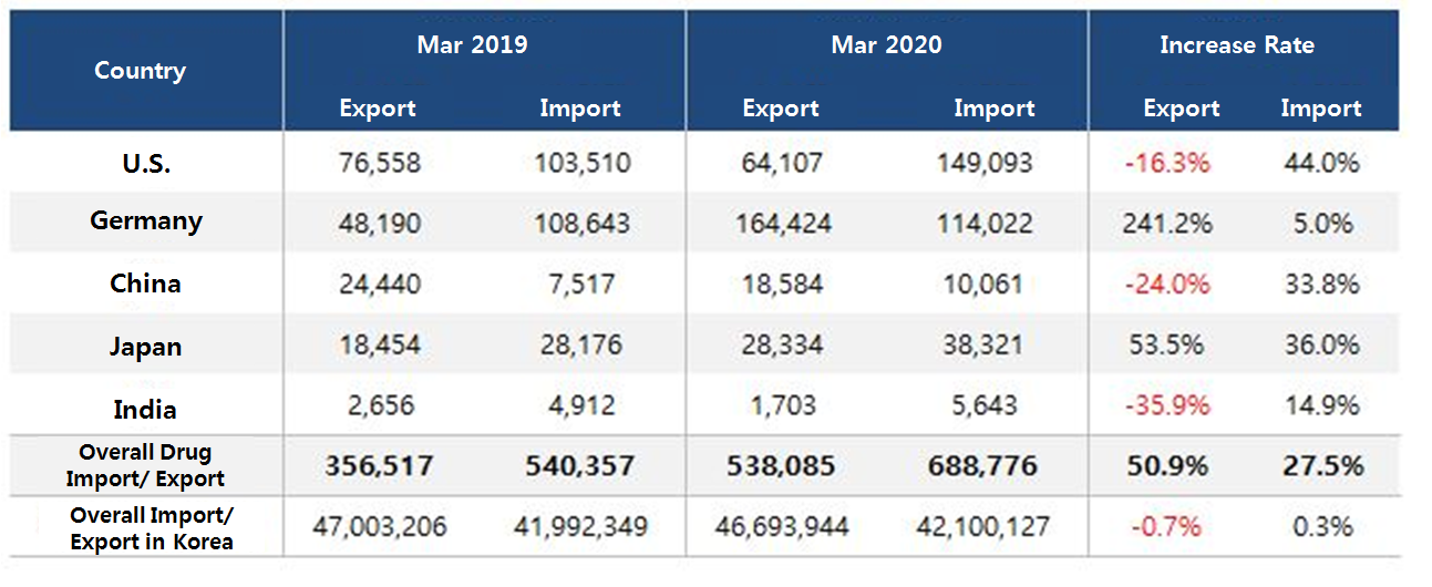 The Korean-made pharmaceutical export volume has gone up by 51.3 percent, compared to March 2019 at 356.52 million dollars (approximately 437.1 billion won).