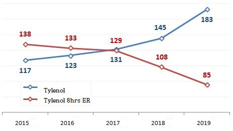 The two flagship products, Tylenol and Tylenol 8hrs ER , are plotting opposite sales figures.