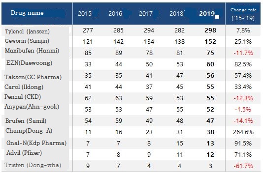 In addition, GC Pharma's Taksen (₩5.6 billion), Ildong’s Carol (₩5.5 billion), Chong Kun Dang’s Penzal (₩5.5 billion), Ahn-gook’s Anyfen (₩5.2 billion), Samil’s Brufen, and Dong-A’s Champ were in the top ten.