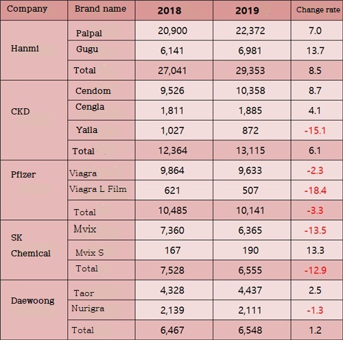 Looking at the sales of erectile dysfunction treatments by company, Chong Kun Dang is facing a challenge to Hanmi Pharm.