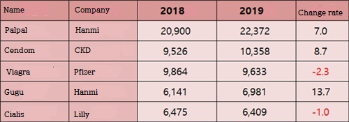 Cialis fell 1.0% from ₩6.5 billion in 2018 to ₩6.4 billion last year.
