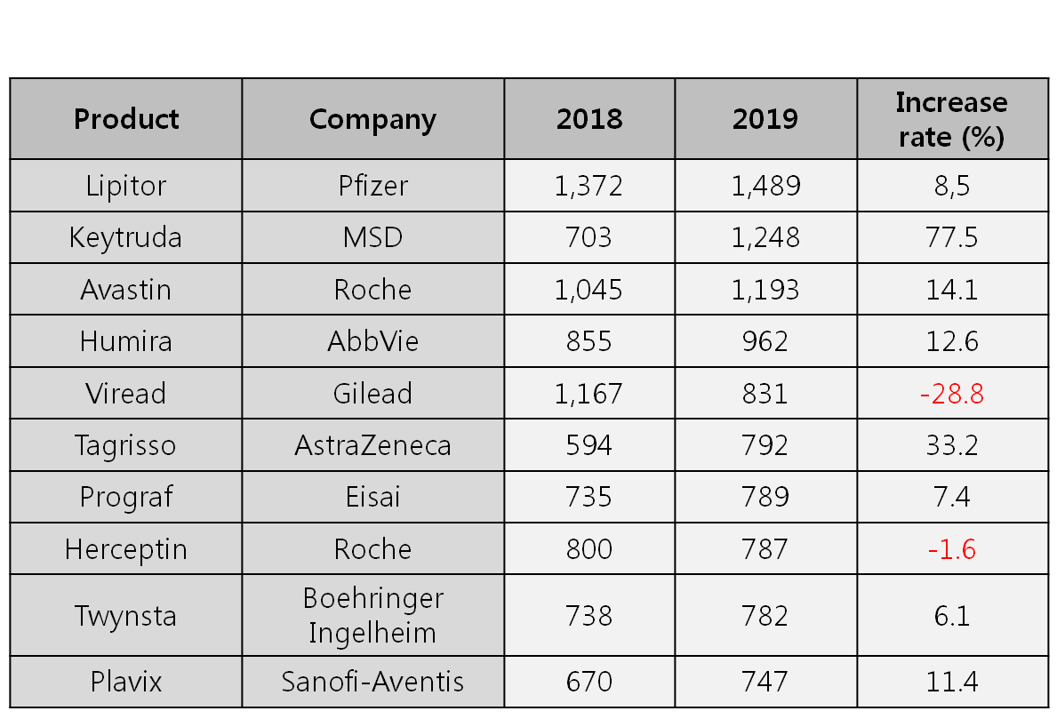 Roche’s anticancer therapy Avastin leapt 14.1 percent from the previous year and made 119.3 billion won, ranking itself on the third place.