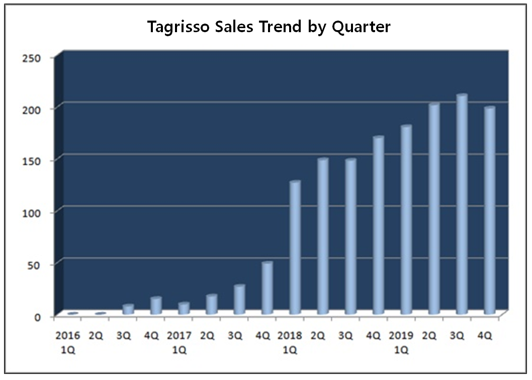 Every year its volume skyrocketed, reaching 2.3 billion won and 10.3 billion won in 2016 and 2017, respectively Tagrisso is a second-line treatment for patients with NSCLC, who have developed tolerance after being treated with existing epidermal growth factor receptor (EGFR) tyrosine kinase inhibitors (TKI), such as Iressa, Tarceva, and Giotrif.