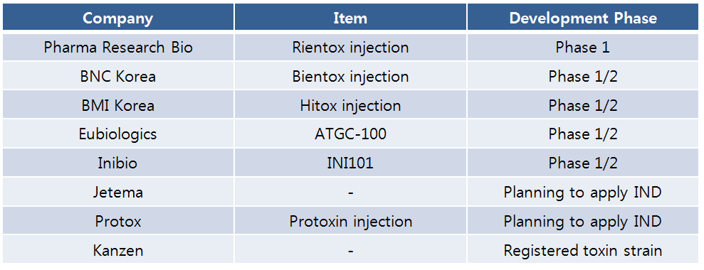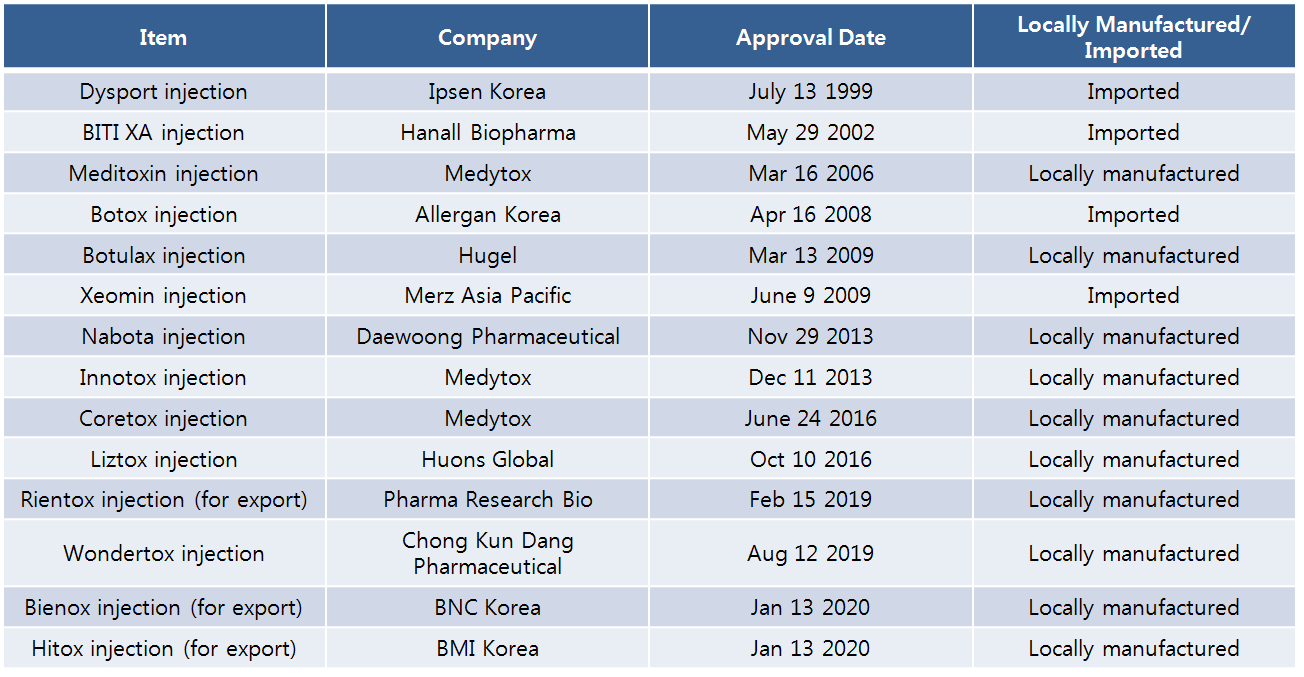 The rest of the list consists of Medytox, Hugel, Daewoong Pharmaceutical, Huons, Pharma Research Bio, Chong Kun Dang Pharmaceutical, BNC Korea and BMI Korea, in the order of approval date.