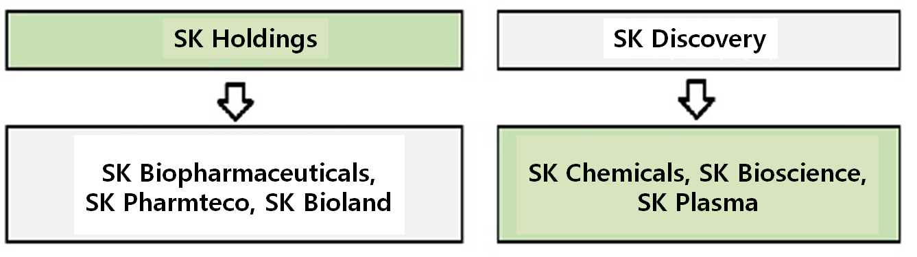 SK Chemicals (pharmaceutical business), SK Plasma (blood products), and SK Bioscience (vaccine) are formed under SK Discovery.