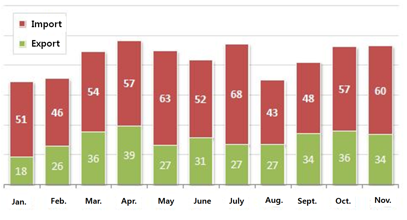 (Source: Korea Customs Service) Apparently, Korea’s overall trade volume has surpassed one trillion dollars this year.