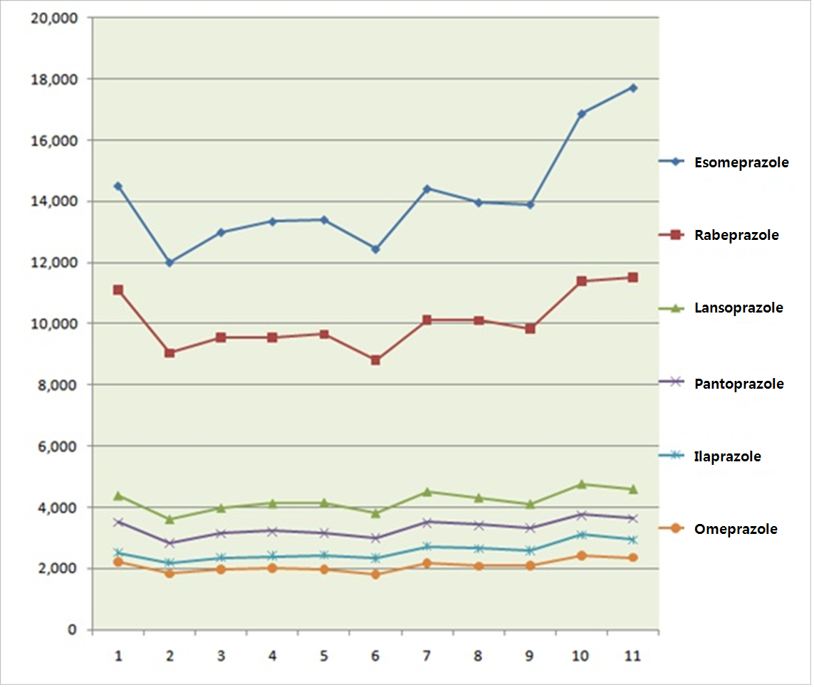 Rabeprazole’s prescription volume in last month went up by 1.2 percent from the month before, but lansoprazole, pantoprazole, ilaprazole and omeprazole’s prescription volume in November were dropped by a little than in October.