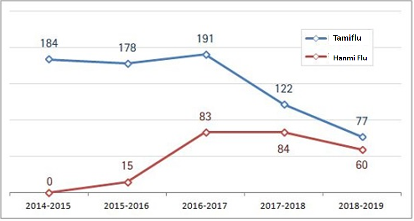 Interestingly, the number one generic Hanmi Flu’s prescription volume has dropped from 8.4 billion won in 2017-2018 season with share of 26.9 percent to 6.0 billion won in 2018-2019 season with 24.3 percent market share.