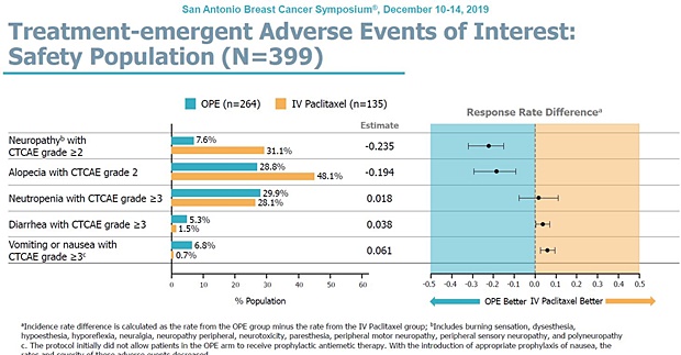 According to the report, the incidence of alopecia and severe neuropathy adverse events was 17% in the Oraxol group, which was lower than 57% in the intravenous group.