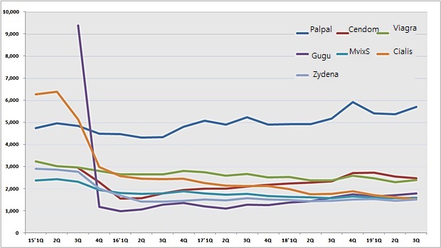 Palpal sold ₩5.7 billion in the third quarter, accounting for 20.1% of the market for erectile dysfunction.
