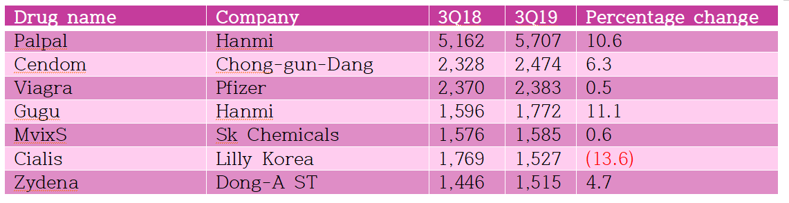 The gap with Dong-A 'Zydena (Udenafil), which ranked seventh in the third quarters, is only ₩10 million.