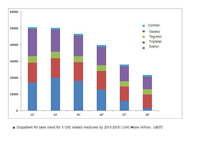 The total sales of five products in the CNS department, including Exelon, dropped 57.3% from ₩51.5 billion in 2013 to ₩21.6 billion in 2018.