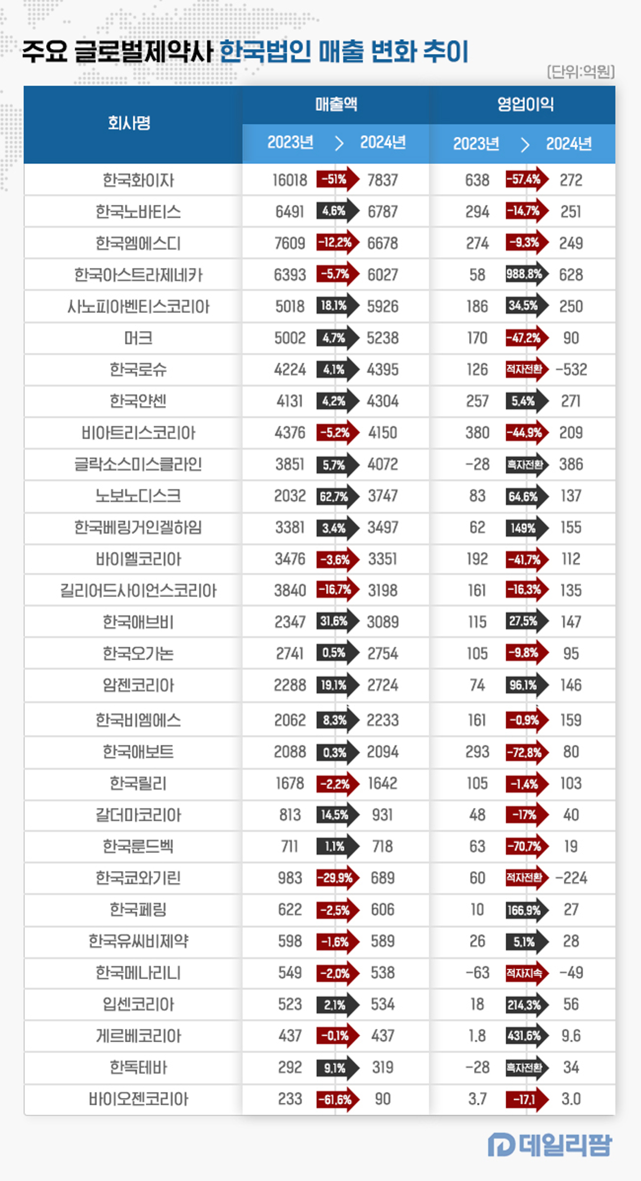 Among the 31 Korean subsidiaries, sales declined at 13 companies, including Pfizer, MSD, AstraZeneca, Viatris, Bayer, Gilead, Lilly, Kyowa Kirin, Ferring, UCB Pharma, Menarini, Guerbet, and Biogen.