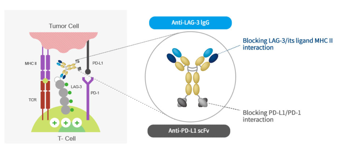 This candidate blocks the binding of LAG3-MHCII and PD‑1-PD‑L1, thereby preventing T cells from being inactivated by tumors.