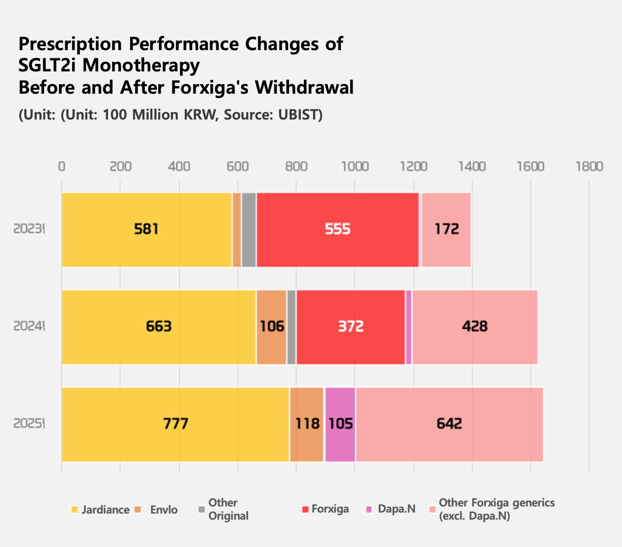 Forxiga recorded KRW 55.5 billion in prescriptions just before its market exit in Korea. At the time, fierce marketing and sales competition unfolded in the SGLT-2 monotherapy market among competing brands and generic manufacturers to capture the over KRW 50 billion annual gap left by Forxiga. Analysts note that this competitive dynamic contributed to nearly 18% market expansion over the two-year period.