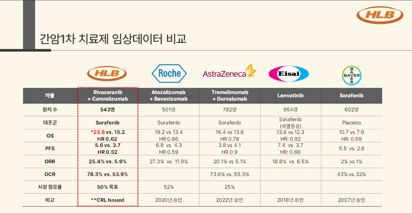HLB applied for an NDA to the FDA in May 2023 for the rivoceranib+camrelizumab combination as a first-line treatment for liver cancer.
