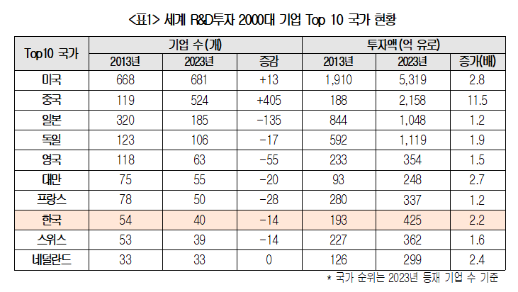 According to the results, the United States ranked No.1 in both the number of companies and investment amount in the 2023 list of top 2,000 companies for R&D investment worldwide.