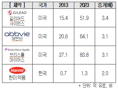 Compared to 10 years before, the R&D investment increases were 3.4-fold for the US-based Gilead Sciences, 3.1-fold for AbbVie, 3.1-fold for Bristol Myers Squibb, and 3-fold for AstraZeneca.