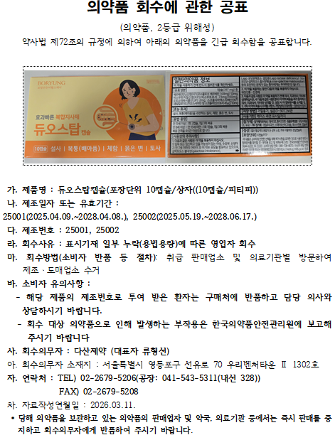 다산제약 '듀오스탑캡슐' 회수
