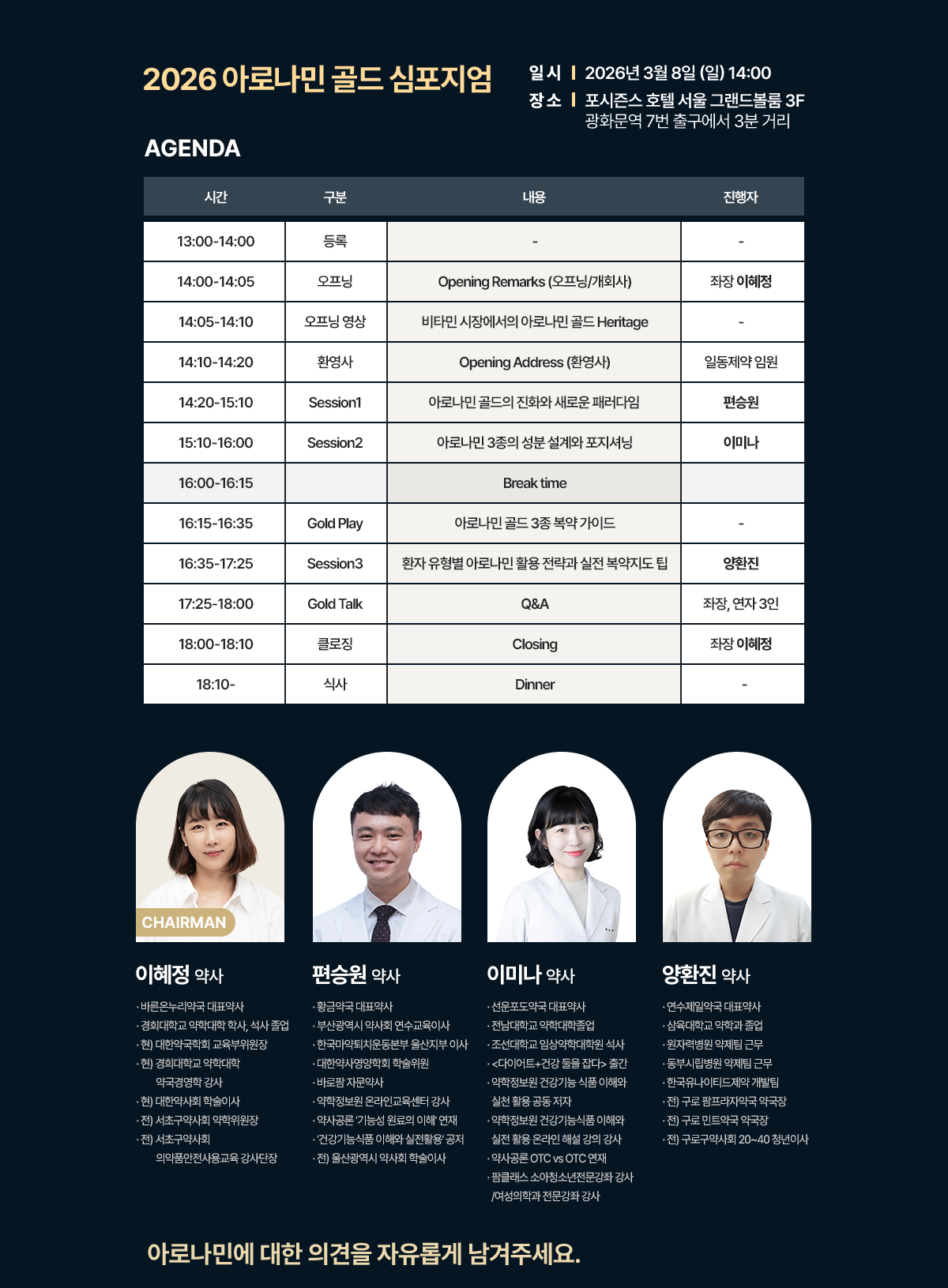 수집업체 : 데일리팜 수집목적 : 심포지엄초청 근무형태 : 개국, 근무, 병원, 기타 수집항목 : 이름, 휴대전화, 면허번호, 약국명, 약국 주소 보관기간 : 심포지엄 진행 후 즉시 파기