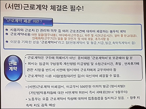 그는 "노동부가 사업장에서 가장 먼저 보는 것이 근로계약서"라며 "점검이 강해지고 있기 때문에 이런 부분들을 미리 준비해 둘 필요가 있다. 근로계약서는 1명이라도 작성을 해야 하는 것"이라고 말했다.