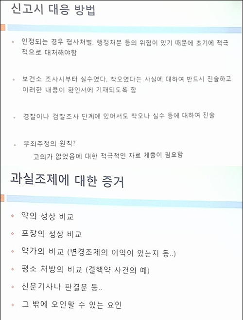 우 변호사는 "과실조제의 경우는 형사처벌이나 행정처분은 없다"면서 "하지만 여전히 보건소에선 고의나 과실을 구분하지 않고 고발하고 있는 실정이고, 신고가 되면 검사가 기소할 확률이 있다. 따라서 약국에선 단순 조제실수임을 입증할 증거 확보가 항상 필요하다"고 강조했다.