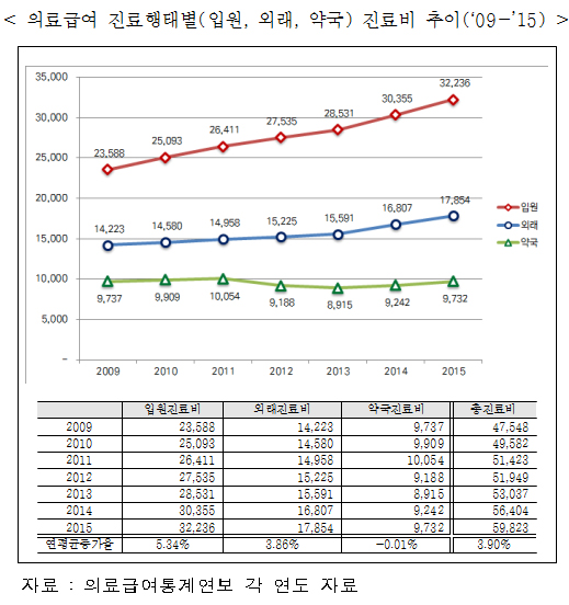 복지부는 최근 진료비 지출증가는 의료보장성 확대와 맞춤형 급여 개편에 따른 수급자 수 증가(147만명→153만명)에 주로 기인한다고 분석했다. 향후에도 노인인구 증가와 의료보장 확대에 따라 증가세는 지속될 것이라고 전망했다.
