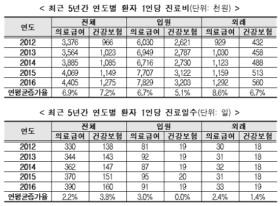 또 2016년 기준 환자 1인당 입원일수는 건강보험 대비 4.8배나 더 길었다. 입원 장기화는 2012년 81일에서 2016년 91일로 더 심화되는 양상이다.
