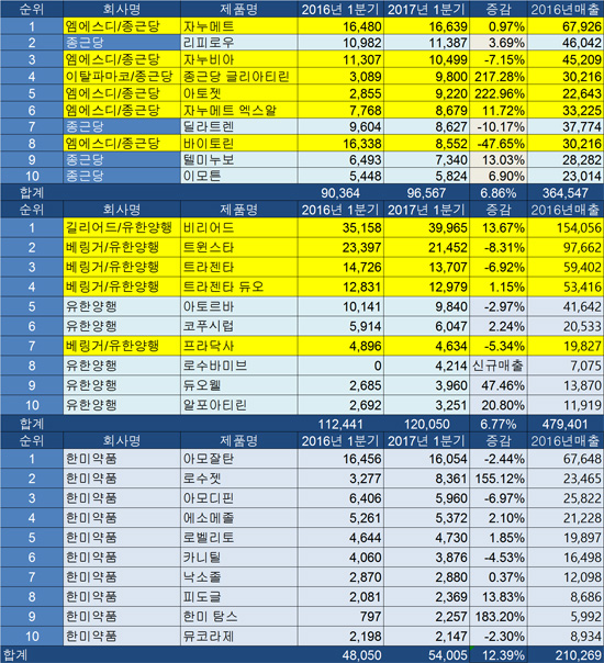 한미약품 10대 품목은 1분기 540억원(12.39%↑)을 기록했다.다 이들의 2016년 매출 합계는 2102억원이다.