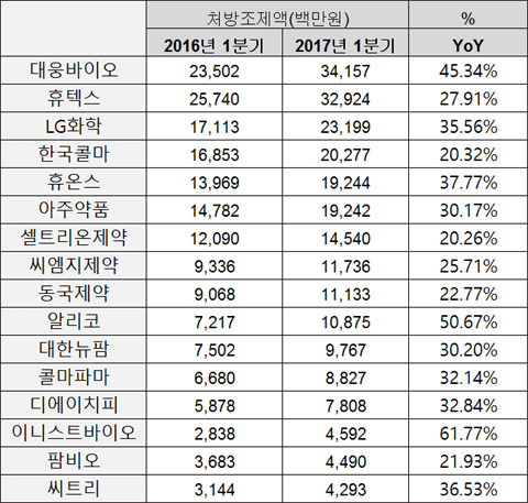 30%이상 성장한 기업은 LG화학, 휴온스, 아주약품, 대한뉴팜, 콜마파마, DHP코리아, 씨트리 등으로 조사됐다.