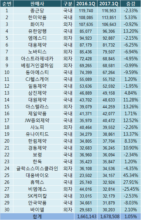 30위권 제약사들의 전체 원외처방실적은 1조6785억원으로 전년동기대비 1.0% 올랐다.