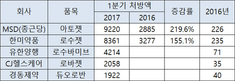 특히 아토젯은 올 1분기 2016년 대비 220% 성장한 92억원대 처방실적을 올려 155% 성장한 로수젯(84억원)을 역전하면서 2품목간 경합은 더욱 치열해지고 있는 양상이다.