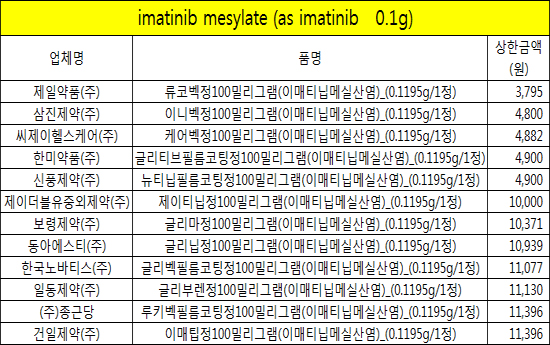 이중 오리지널인 글리벡은 0.1g 함량 뿐이다. 반면 종근당, 일동제약, 동아에스티, 보령제약, 신풍제약, 씨제이헬스케어 등 6개 제약사는 0.1g, 0.2g, 0.3 제품을 다 보유하고 있었고, 한미약품의 경우 특이하게 0.2g 제품은 없고 대신 0.1g과 04g에 유일하게 0.3g 제품을 등재시켰다.
