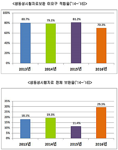 또 자료보완 요구 없이 적합 처리된 비율은 70.3%로 전년대비 10.9%, 2014년보다 8.8%, 2013년와 비교해서는 10.4% 줄어든 경향을 보였다. 지난해 보완율은 29.3%로 예년에 비해 큰 폭으로 증가했다.