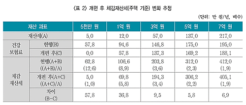 하지만 보험연구원은 나머지 재산 과표 구간에서는 5000만원 공제가 체감재산세에 미치는 영향이 크지 않다고 내다봤다.