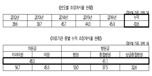 조정신청 상위 5개 의료기관 종별 조정개시율 현황을 살펴보면 의원급의 개시율이 48.3%으로 병원급 41.1%보다 높았다.