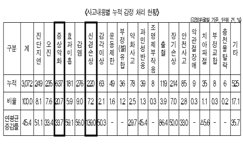 그러나 증상악화의 연 평균 증가율은 33.7%로 전체 증가률 45.4%를 밑도는 반면, 신경손상(139.0%), 출혈(86.4%) 등은 급증 추세를 보였다.