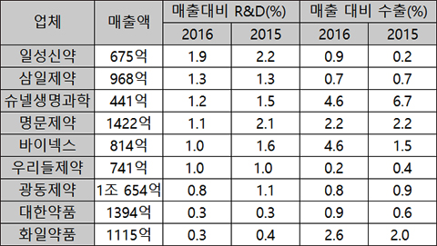 조사결과 매출대비 연구개발 비중이 2%가 채 안되는 상장기업은 9곳에 달했다. 대한약품, 화일약품(0.3%), 우리들제약, 바이넥스(1%), 명문제약(1.1%), 슈넬생명과학, 삼일제약(1.3%), 일성신약(1.9%) 등이 대표적이다.
