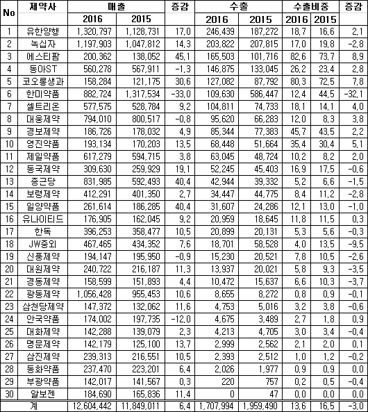 한편 상위 제약사 중 광동제약 등 업체들은 여전히 1% 미만의 수출비중을 보였다. 알보젠코리아의 경우 2016년 수출액이 제로(0)로 잡히기도 했다.